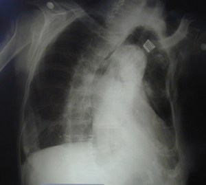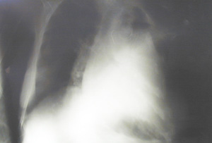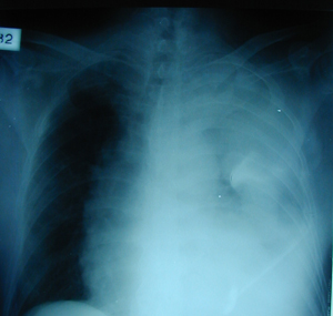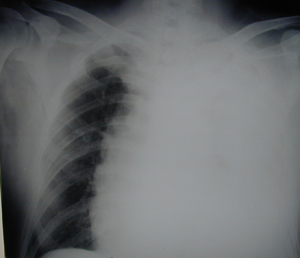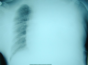 Οπισθιοπροσθία ακτινογραφία θώρακος όπου υπάρχει πλήρης κατάληψη του αριστερού ημιθωρακίου από υγρό που προκαλεί μετατόπιση του μεσοθωρακίου προς την υγιή πλευρά. Ο ασθενής παρουσιάστηκε με έντονη δύσπνοια, και από το ιατρικό ιστορικό του ο ασθενής ανέφερε την λήψη αντιπηκτικών.