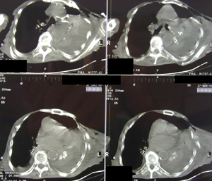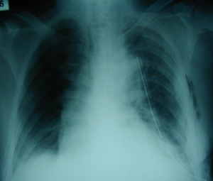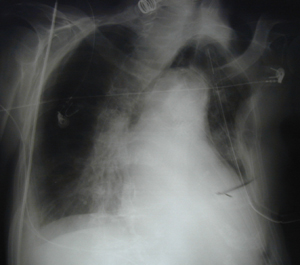 Οπισθιοπροσθία ακτινογραφία του θώρακος μετά από προσπάθεια εκκένωσης του υγρού με την εισαγωγή σωλήνα παροχέτευσης θώρακος, αφού είχε τεθεί η διάγνωση αιμοθώρακος με διαγνωστική παρακέντηση. Ο έλεγχος του αίματος έδειξε ότι υπήρχε μεγάλη παράταση του χρόνου προθρομβίνης από τα αντιπηκτικά.