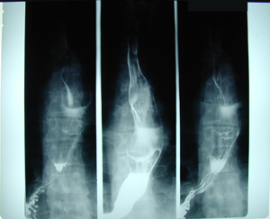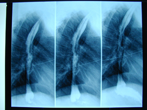Ακτινογραφία οισοφάγου μετά από την κατάποση βαριούχου γεύματος. Υπάρχει έλλειμμα πληρώσεως του αυλού του οισοφάγου, όπως και διάταση του αυλού.