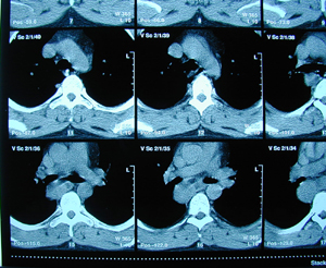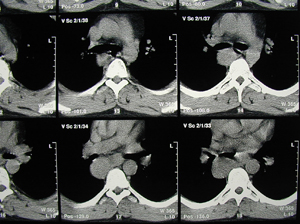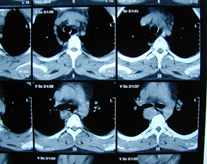 Αξονική τομογραφία του θώρακος σε διαφορετικά επίπεδα. Διακρίνεται η παρουσία όγκου στο οπίσθιο μεσοθωράκιο που πιθανά να αποτελεί όγκο του οισοφάγου.