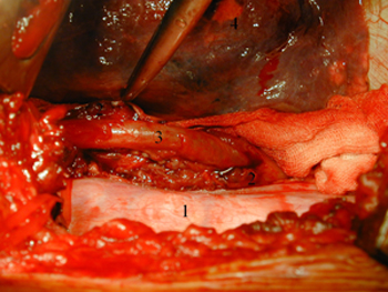 Διεγχειρητική φωτογραφία μετά την δεξιά θωρακοτομή και αφαίρεση του όγκου του οισοφάγου. Υπάρχει διατομή, παράλληλη προς τον επιμήκη άξονα του οισοφάγου. Έχει προκληθεί διάταση του αυλού του οισοφάγου με την εμφύσηση αέρα για τον έλεγχο τυχόν ύπαρξης διαφυγής λόγω τραυματισμού κατά την διαδικασία αφαίρεσης του όγκου.