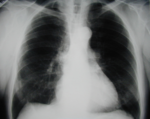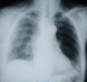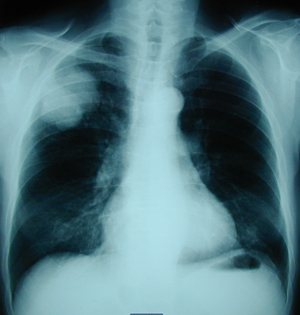 Οπισθιοπρόσθια ακτινογραφία θώρακος που δείχνει όγκο στο δεξιό άνω λοβό.