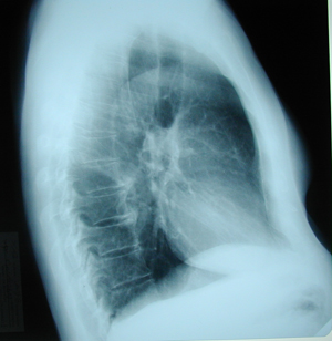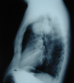 Πλάγια ακτινογραφία θώρακος. Διακρίνεται μάζα στον άνω λοβό στο ύψος του αορτικού τόξου.