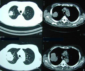 Αξονική τομογραφία θώρακος που δείχνει μάζα εκ μαλακών μορίων ( όγκος ) στον άνω λοβό του δεξιού πνεύμονος.