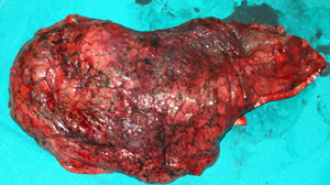 Φωτογραφία ενός λοβού του πνεύμονος μετά από την αφαίρεσή του. Διακρίνεται ο όγκος στο αριστερό πλάγιο μέρος της φωτογραφίας, που υπεγείρει το υπερκείμενο πνευμονικό παρέγχυμα. Επίσης διακρίνεται η γραμμή συρραφής του πνεύμονος προκειμένου να διαχωριστεί ο άνω λοβός από τον μέσο λοβό.
