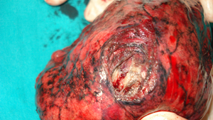 Φωτογραφία του λοβού αφού έγινε διατομή του υπερκείμενου πνευμονικού παρεγχύματος. Διακρίνεται ο καρκίνος στο βάθος της τομής.