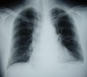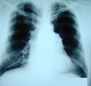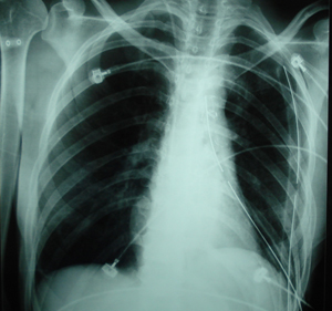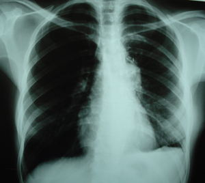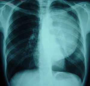 Οπισθιοπροσθία ακτινογραφία θώρακος. Διακρίνεται διεύρυνση του μεσοθωρακίου που οφείλεται στην ύπαρξη όγκου στο μεσοθωράκιο.