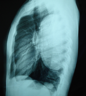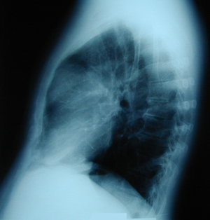 Πλάγια ακτινογραφία θώρακος, στην οποία διακρίνεται μάζα στον οπισθοστερνικό χώρο στο ανώτερο πρόσθιο μεσοθωράκιο.
