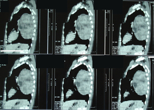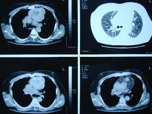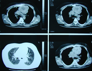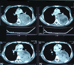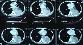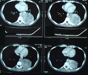 Αξονική τομογραφία θώρακος. Διακρίνεται η παρουσία μάζας από μαλακά μόρια προπερικαρδιακά, οπισθοστερνικά, με προβολή προς τα αριστερά. Η μάζα αυτή έχει ομαλά όρια με ομοιογενή πυκνότητα. Οι συχνότεροι όγκοι που εντοπίζονται σε αυτή την θέση είναι του θύμου αδένα.