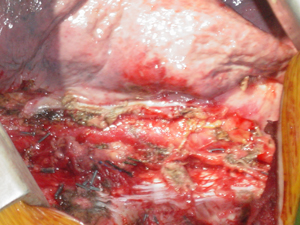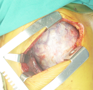 Διεγχειρητική φωτογραφία. Μετά από την είσοδο στην θωρακική κοιλότητα και την διαστολή των πλευρών προβάλλει ευμεγέθης σκληρή μάζα με μεγάλη αγγειοβρίθεια.