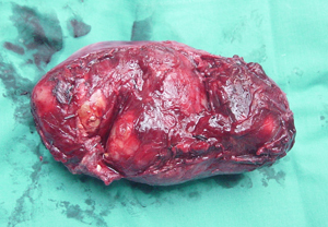 Χειρουργικό παρασκεύασμα. Ο όγκος είχε διαστάσεις 17x10.8x9.5 εκ. και η ιστολογική εξέταση έδειξε ότι πρόκειται για νευρογενή όγκο, που λέγεται Σβάννωμα ή νευρολείμμομα.