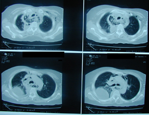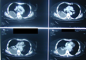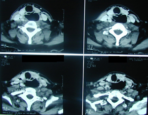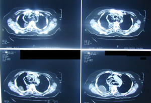 Αξονική τομογραφία θώρακος σε διαφορετικά επίπεδα. Αναδεικνύει τα ίδια ευρήματα με την απλή ακτινογραφία και θέτει την διάγνωση της ρήξης της τραχηλικής μοίρας του οισοφάγου με εικόνα εμπυήματος του δεξιού ημιθωρακίου και εικόνα μεσοθωρακίτιδας με υδραερικό επίπεδο τόσο στο μεσοθωράκιο όσο και στον τράχηλο.