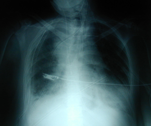 Οπισθιοπροσθία ακτινογραφία θώρακος ασθενούς που είχε εργώδη διασωλήνωση για χολοκυστεκτομή. Υπάρχει μεγάλη υπεζωκοτική συλλογή στο δεξιό ημιθωράκιο, υπάρχει υδραερικό επίπεδο στο ημιθωράκιο όπως και αέρας στο μεσοθωράκιο και στον τράχηλο.