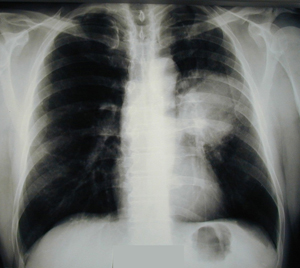Ακτινογραφία θώρακος ( οπισθιο-πρόσθια ) που δείχνει ευμεγέθη όγκο της αριστερής πύλης.