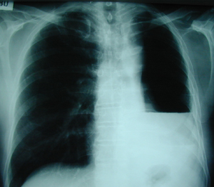 Μετεγχειρητική ακτινογραφία θώρακος, ένας μήνας μετά από την πνευμονεκτομή. Στο αριστερό ημιθωράκιο υπάρχει υδραερικό επίπεδο, που δηλώνει την αναμενόμενη συλλογή υγρού και την έναρξη της απορρόφησης του αέρα από τον χώρο της πνευμονεκτομής. Ο χρόνος που χρειάζεται για να γεμίσει η κοιλότητα της πνευμονεκτομής με υγρό κυμαίνεται από τρεις εβδομάδες έως επτά μήνες, με μέσο όρο 3,9 μήνες.
