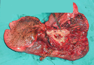 Φωτογραφία χειρουργικού παρασκευάσματος. Δεξιός πνεύμονας με ευμεγέθη όγκο που διηθεί τον άνω λοβό με επέκταση προς την πύλη.