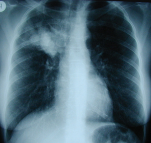 Οπισθιο-πρόσθια ακτινογραφία θώρακος. Διακρίνεται ευμεγέθης όγκος στον δεξιό άνω λοβό του πνεύμονος που επεκτείνεται και συνδέεται με την πύλη.