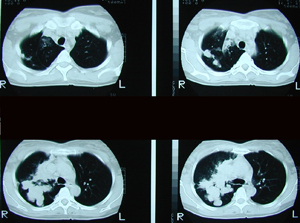 Αξονική τομογραφία θώρακος που δείχνει μάζα εκ μαλακών μορίων στον δεξιό άνω λοβό με επέκταση προς την πύλη. Πρόκειται για μάζα με ανώμαλα όρια και πολυλοβωτή μορφολογία.