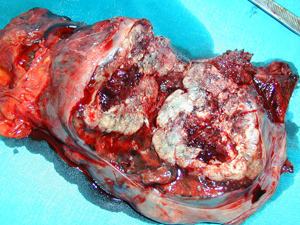 Το χειρουργικό παρασκεύασμα, που είναι ολόκληρος ο πνεύμονοςς με τον όγκο να διακρίνεται κεντρικά. Η ιστολογική εξέταση έδειξε ότι πρόκειται για πλακώδες καρκίνωμα που αποτελεί τον συχνότερο ιστολογικό τύπο.