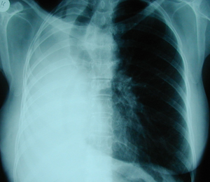 Οπισθιοπροσθία ακτινογραφία θώρακος πολλά χρόνια μετά από δεξιά πνευμονεκτομή. Πλήρης κατάληψη του χώρου της πνευμονεκτομής από υγρό, υπερέκπτυξη του αριστερού πνεύμονος και έλξη του μεσοθωρακίου προς την χειρουργηθείσα πλευρά.