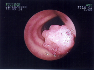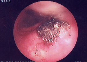 Βρογχοσκοπική εικόνα της τραχείας με την χρήση εύκαμπτου βρογχοσκοπίου. Διακρίνεται ευμεγέθης όγκος (ανθοκραμβοειδής μάζα), που αποφράσσει τον αυλό της τραχείας κατά 85% περίπου.