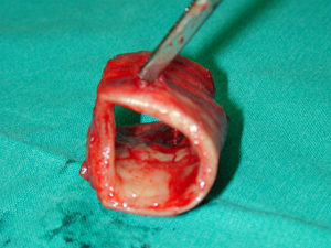 Βρογχοσκοπική εικόνα με την χρήση εύκαμπτου βρογχοσκοπίου. Διακρίνεται η γραμμή συρραφής της τραχείας, η οποία έγινε με την χρήση μη απορροφήσιμων ραμμάτων Prolene 2/0. Η συρραφή είναι συνεχής και γίνεται σε ένα στρώμα.