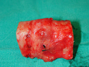 Τμήμα τραχείας μήκους 4,5 εκ., περίπου που είναι διηθημένο από κακοήθη όγκο. Ο όγκος λείπει από τον αυλό της τραχείας καθώς είχε προηγηθεί καυτηρίαση του προβάλλοντος τμήματος αυτού εντός του αυλού της τραχείας. Διακρίνεται μόνο η βάση του, εντός του αυλού αλλά και φαίνεται ο όγκος να διηθεί το τοίχωμα της τραχείας εξωτερικά.