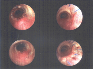 Βρογχοσκοπική εικόνα της τραχείας με την χρήση εύκαμπτου βρογχοσκοπίου. Έγινε καυτηρίαση του όγκου με την χρήση ακτίνων Nd. YAG Laser, προκειμένου να επιτευχθεί η διασωλήνωση του